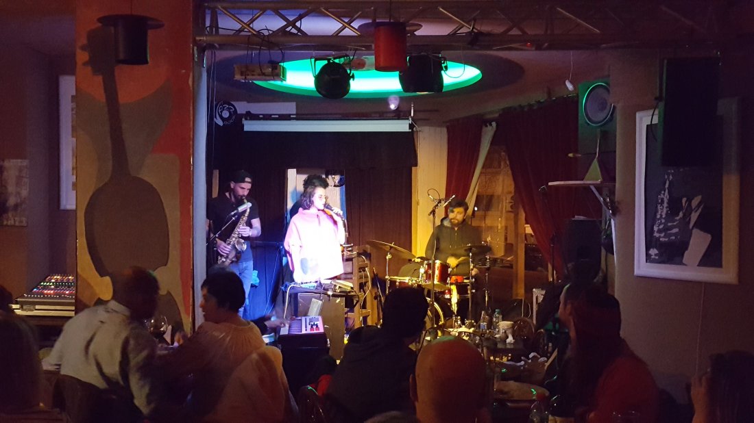 Am intrat pe prima piesă cântată doar de Ana-Cristina, dar am apucat să-i răspund la “Bună seara” :). Vreo 60, poate 70 de oameni, umpleau locul stând pe la mese. Atmosfera cozy, vin în pahare. Şi a început să curgă electro-(soul-dub)- jazzul. Uneori domol, plutind pe vocea Cristinei şi saxofonul lui Alexandru Arcuş, alteori drăceşte pe ritmul lui Tavi Scurtu la tobe, clapele lui Albert Tajti şi bassul lui Michael Acker.