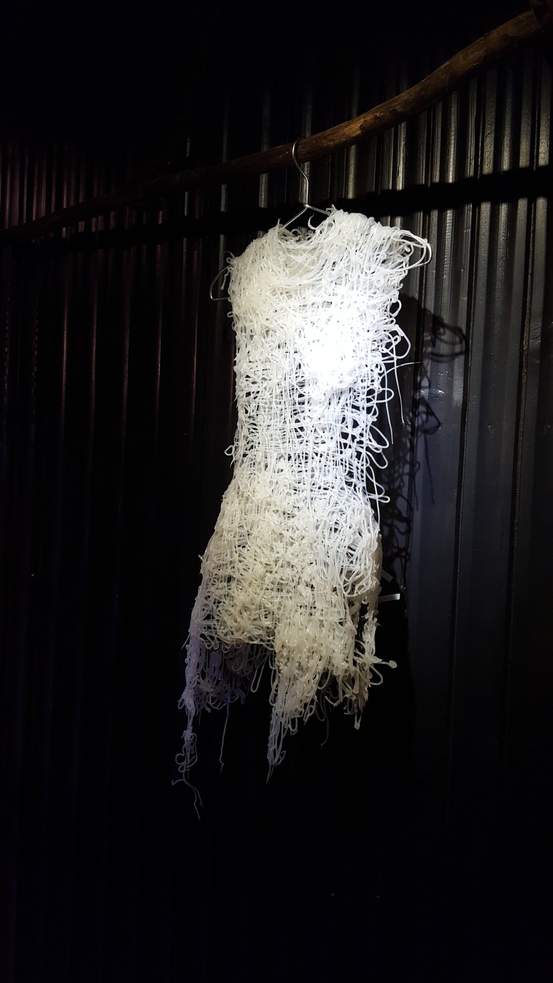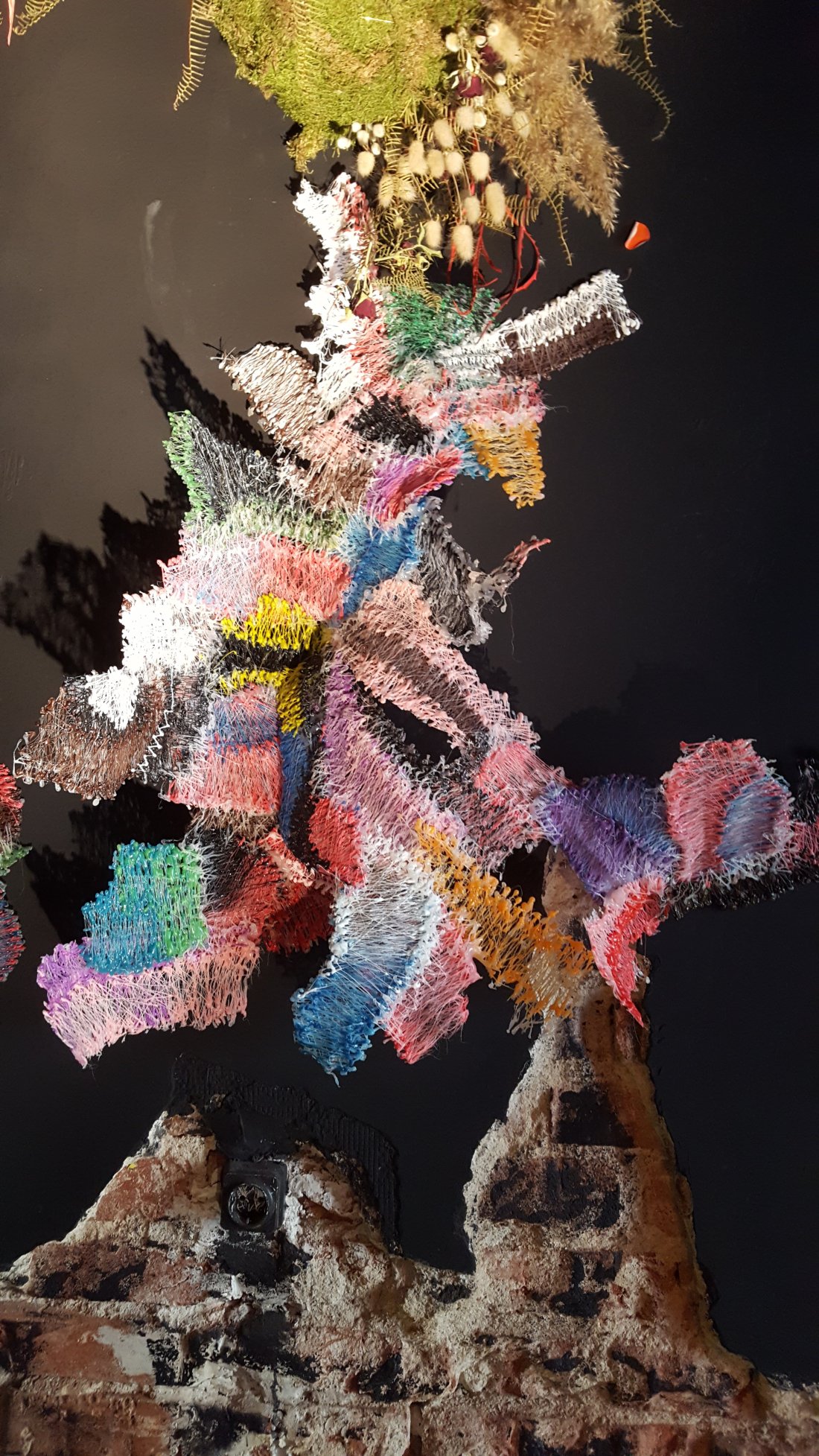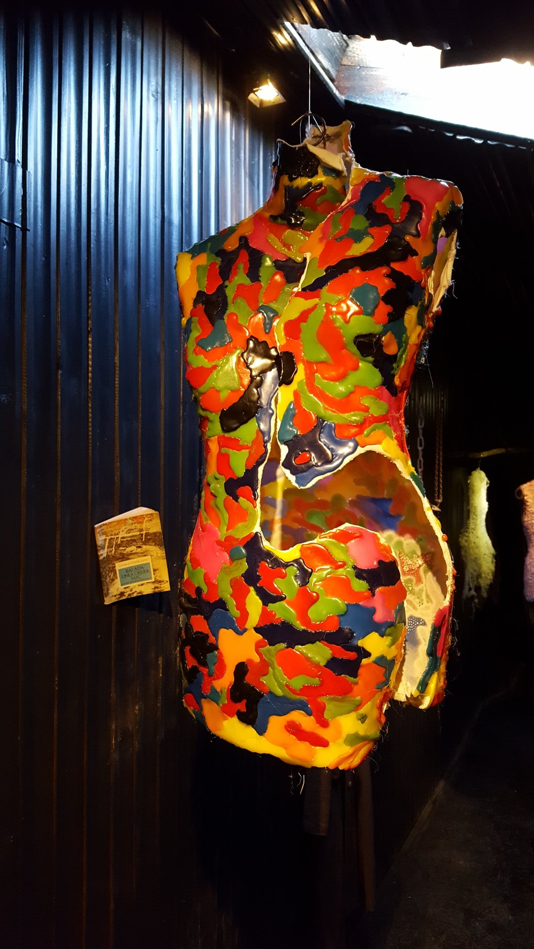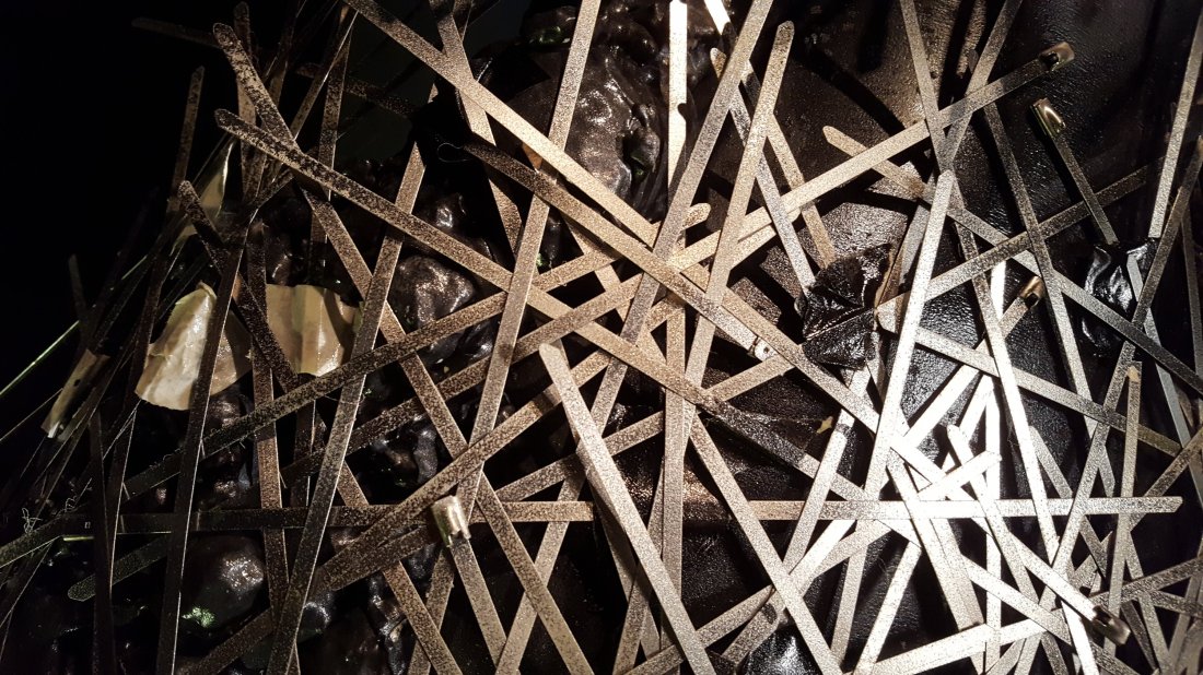 Cam asta e viziune pe care mi-a exprimat-o și în cuvinte pentru că am avut norocul să-mi prezinte chiar el expoziția. Am simțit în glasul și pasiunea cu care povestea pe cineva care e la început de drum, dar care și l-a găsit :). Fie că se joacă cu glue gun-ul și culorile plasticului, fie că e vorba de silicon, prelată de tir, sârmă oțelită sau plasă de Buzău el caută formele după o schiță imaginară ascunsă în mintea lui. Ce rămâne la final e drumul acestei viziuni in the making.