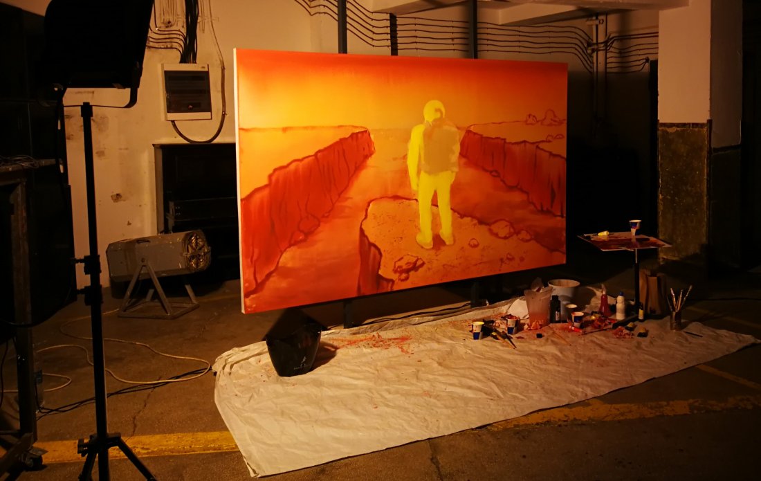 Am participat ca reprezentant al Fine Sounds cu cărțile poștale muzicale Soundcards la HUB-ul cultural Visssual de pe strada Fabricii. O locație numai bună pentru un asemenea eveniment. De la intrare se auzea muzica ambientală samplată și mixată live de Dinu Ivancu (Moduler). Muzica lui, un conglomerat de ritmuri și sunete spațiale a avut rolul de background music pentru Adrian Preda, care a susținut o sesiune de live painting. De data aceasta ne-a lucrat la o pictură imensă ce avea în centru un astronaut ce stă pe o stâncă uitându-se spre văile infinite ale unei planete străine.