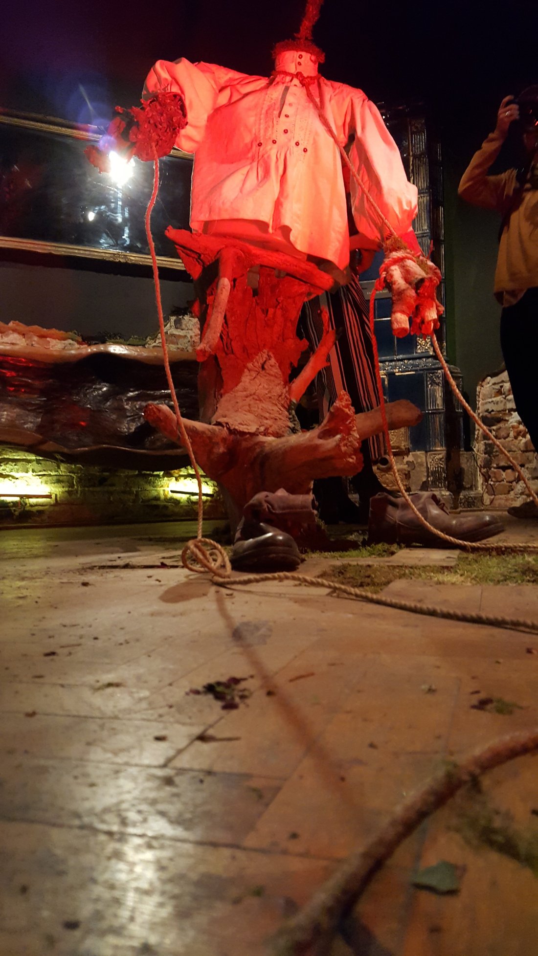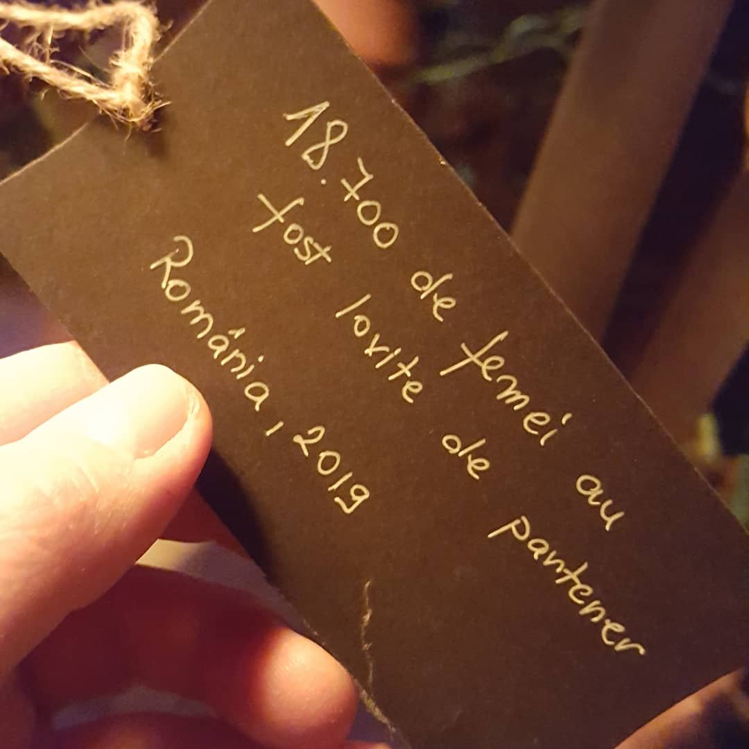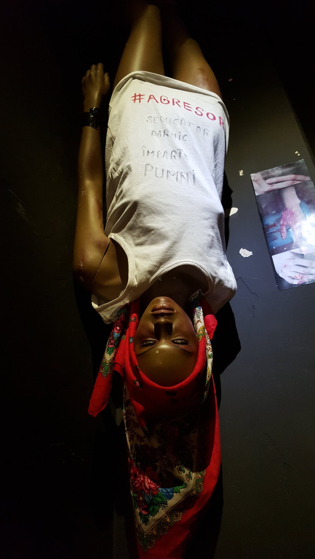 Încă de la intrare te întâmpina în holul central de la parter un copac/instalație care ținea agățată între crengile lui o rochie delicată, captivă parcă, iar pe restul crengilor mesaje cu statistici sumbre despre violența domestică în România sau hasthtagurile abuzatorilor. Te treceau fiori regăsindu-te și pe tine în rolurile alea.