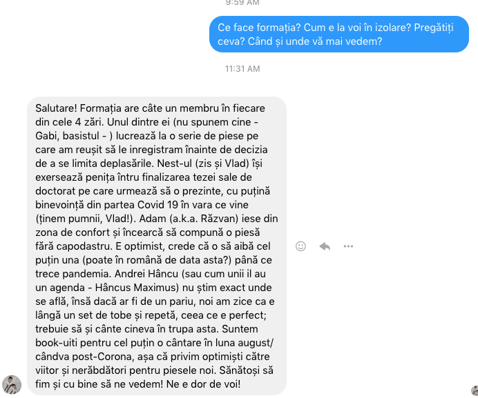 Și revin, imaginează-ți, o să treacă toate, se vor face iar concerte, evenimente, festivaluri, și vom fi la toate mai mulți ca niciodată, mai fericiți ca niciodată. Ai să vezi!