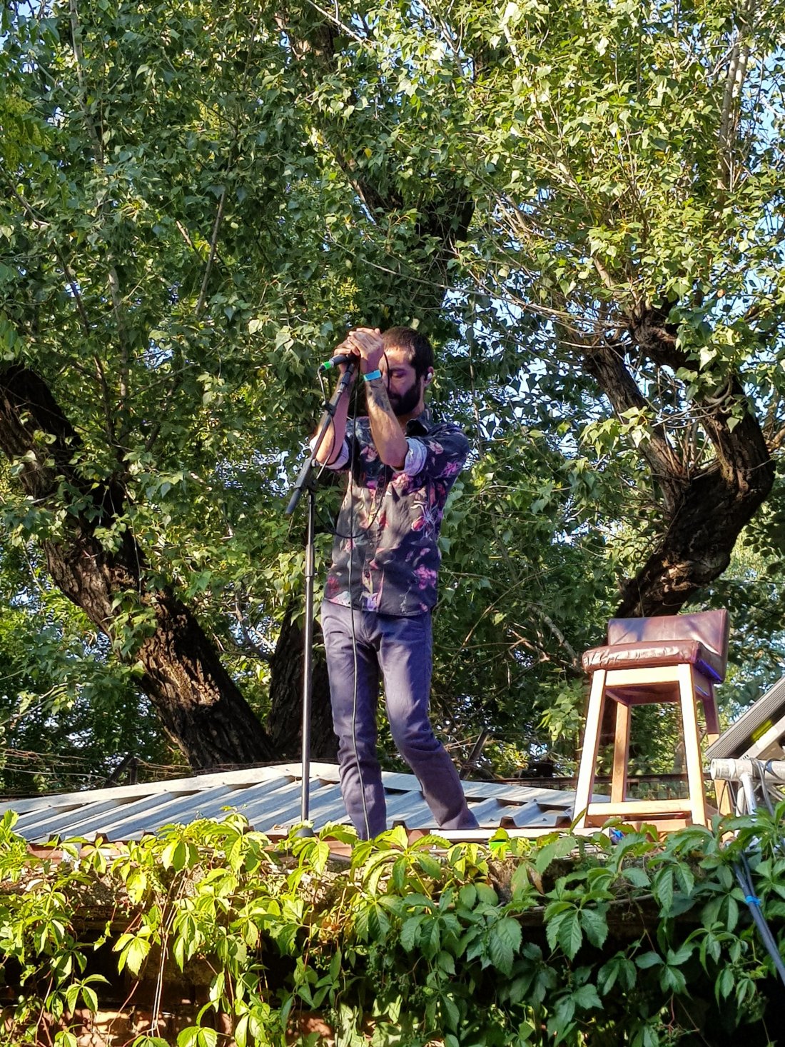 Să revin la concert. Backyard Acoustic Season e doar cu numele 😜. N-a fost Backyard ci Up on the Shed, și nu acustic ci full electric, mai puțin Curaj. Da’ știți ceva? Who the f**k cares !? Eu voiam muzică live și din pom la flaut așa că am pornit cu toate așteptările setate pe modul îngăduitor.Pentru cei care nu știu cum arată treaba cu concertul post-pandemic la Expirat nu vă scandaizați. Se respectă și para-respectă regulile. Tobele și basul au stat pe niște piedestale înăuntru în dreptul celor două mari ferestre, iar Paul și Andrei sus pe șopron, în plin soare de asfințit – am uitat să vă spun că au fost două concerte cu ei, unul de la 18:30 iar celălalt de la 20:30, eu ajungând la primul dintre ele. Chiar, cum o fi pentru artiști să-și dozeze energia pentru două spectacole concecutive?