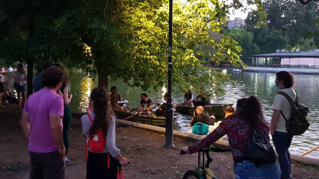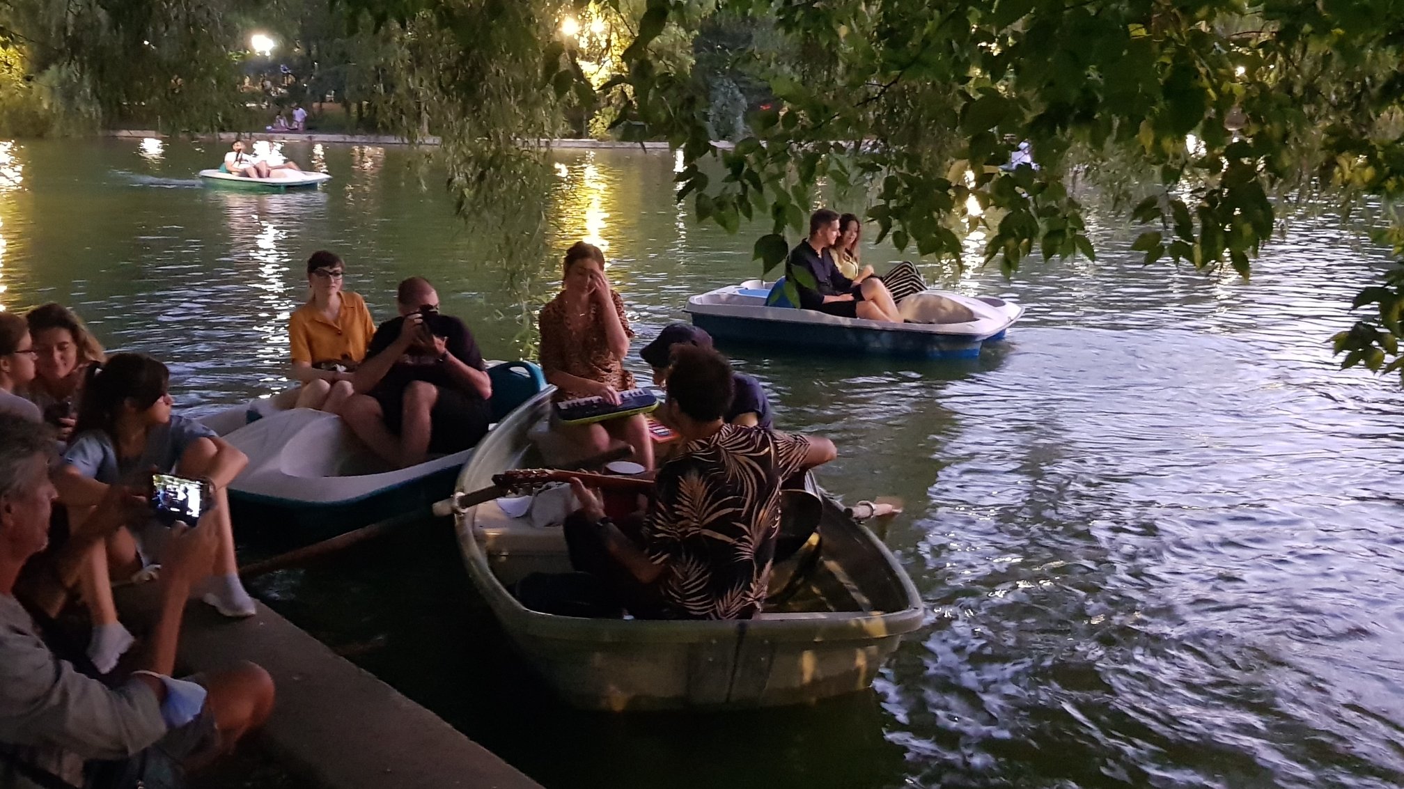 Să fi fost vreo 40 de spectatori care s-au adunat cumva în jurul muzicii lor. Era un sentiment de Music can change the world. Unii erau fani și abia asteptau să-i revadă -ca mine-, dar alții au fost atrași de ce auzeau și asta era încă și mai frumos. Au simțit și ei asta, cred, pentru că planul era ca seara să se încheie cu Cântec de seară, unul dintre cele mai vechi cântece ale lor și cu un clip ce se petrece parțial chiar prin Grădina Cișmigiu, dar a ieșit cu bis la bis la bis. Cerute discret mai mult din priviri, din aplauze sau din încăpățânarea tăcută de a pleca. Cred că încă vreo trei piese s-au mai strecurat în playlist. Pe Say you’re mine a trebuit totuși să-și ia la revedere și să vâslească spre debarcader în aplauze. Depășiseră oricum ora la care trebuia returnată barca 😝.