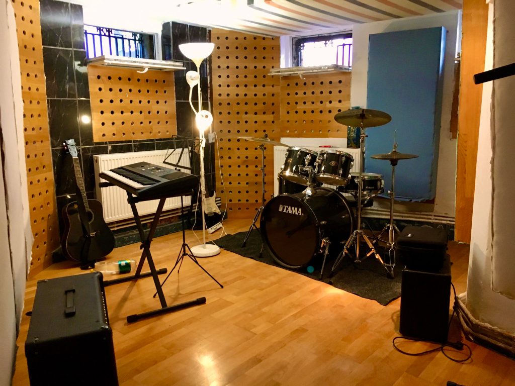 Ștefan: Suntem chiar lângă Universitatea Națională de Muzică, vis-a-vis de Cișmigiu. Aproape de cam orice și oricine. Avem posibilitatea înregistrării a 16 canale audio, deci în funcție de workflow-ul trupei sau artistului putem înregistra chiar și live un band întreg și tot ne mai rămân câteva track-uri. Avem un set de tobe Tama Imperial, două ampuri Marshall de bass și chitară, o clapă yamaha, un controller Korg, cameră de monitorizare, microfoane standard profesionale dinamice, condensatoare, etc. Avem o toaletă super curată și o mini bucătărie unde putem face o cafea, un sandviș, un gulaș plus o terasă superbă unde nu bate niciodată soarele direct și unde se poate sta la vorbă în pauze. De asemenea, o să fac și un creative session o dată pe săptămână cu capacitate de 7 artiști care va fi gratuit, special pentru a încuraja muzicienii, graphic designerii, pictorii, etc. să se obișnuiască cu mediul de studio și să iasă din zona de comfort fuzionând cu oameni diferiți din arte asemănătoare sau complet diferite. Sessionul va fi înregistrat atât video cât și audio, iar artiștii se înscrie cu un mini portofoliu de creație.