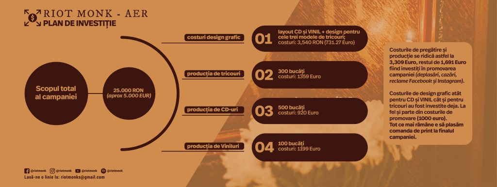 - Contribui cu 160 RON și vei primi bundle-ul CD și vinil „AER” + tricou la alegere, albumul în format digital pe data de întâi Noiembrie, înainte de lansarea oficială, un pachet de stickere Riot Monk create de Mara Conopan de la CREEPS.ro, și vei fi trecut în booklet și insert la secțiunea mulțumiri speciale.