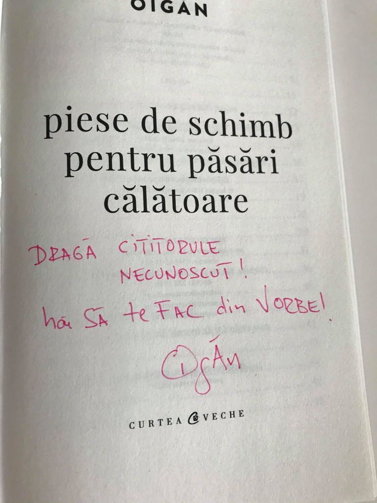 Mergeam spre clubul meu imaginar și mi-a sărit în ochi dintr-o vitrină de librărie un titlu- Piese de schimb pentru păsări călătoare…. Mă apropii să văd cine a scris-o. Surpriza m-a pălit! Oigăn. Pun mâna pe telefon și-l sun.