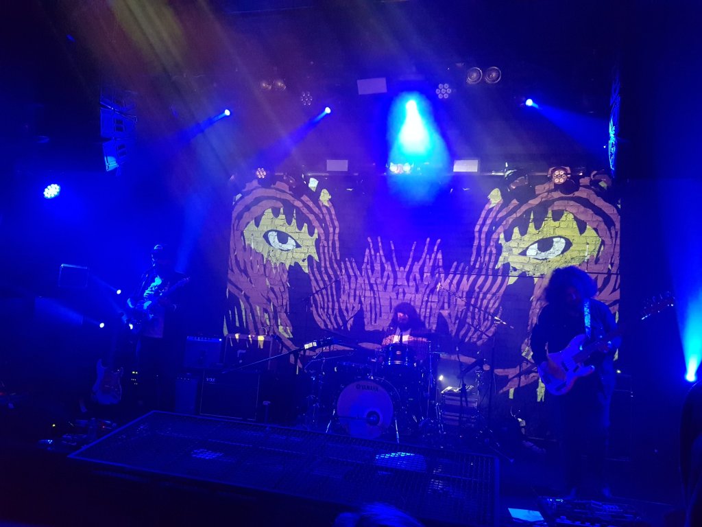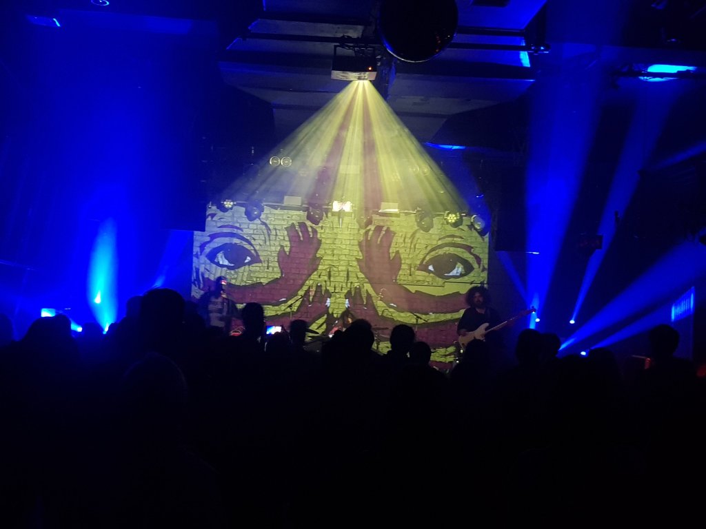 Tot concertul a fost acompaniat de un visual făcut live de Pisica Pătrată aflat la baza scenei, practic un membru al trupei deja. Hipnotizantă joaca lui pe zidul Controlului. O artă naivă într-o perpetuă transformare, urmărind oarecum temele cântecelor, centrată pe ochi de pisici șuie sau pătrate 😜.