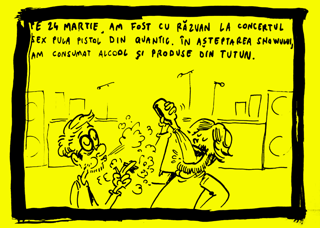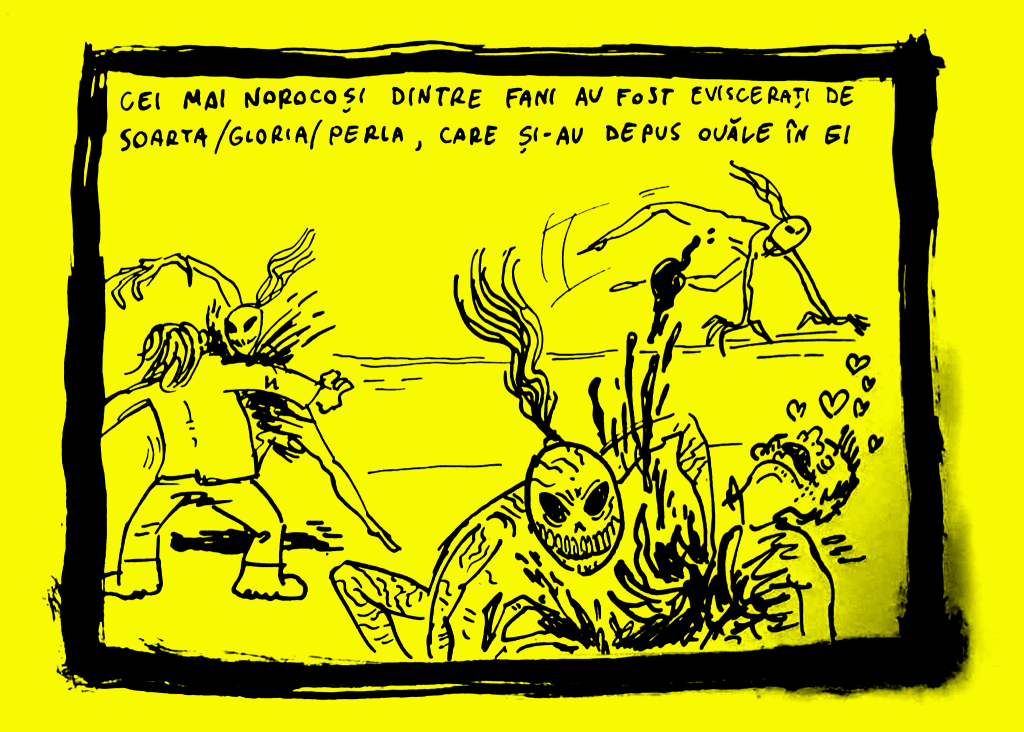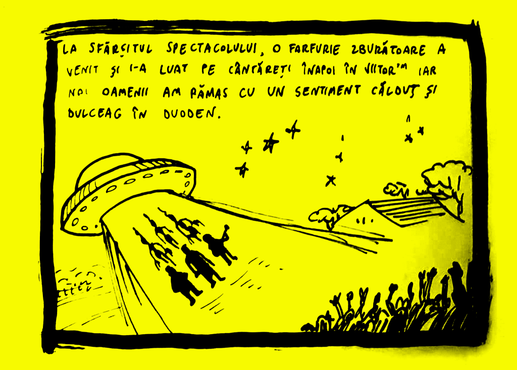 M-am trezit lângă geaca pe care o ascunsesem. Lângă mine era și Nilu care desena ceva din memorie. Cică și el fusese răpit. Nu mai ținea bine minte în ce dimensiune ajunsese, timp sau în ce univers pularel. Vă zic, am fost în viitor. Am reușit să surprind pe telefon câteva imagini că altfel nu mă credeați. Dar mai bune-s desenele lu’ Nilu. Poate ați pățit și voi așa. Dați-mi de știre. Aaaa, de ce striga oare lumea Sex Pula Pistoooool !?