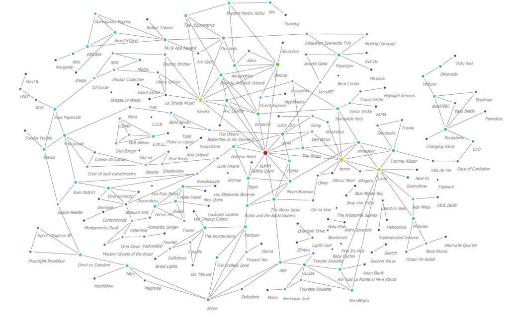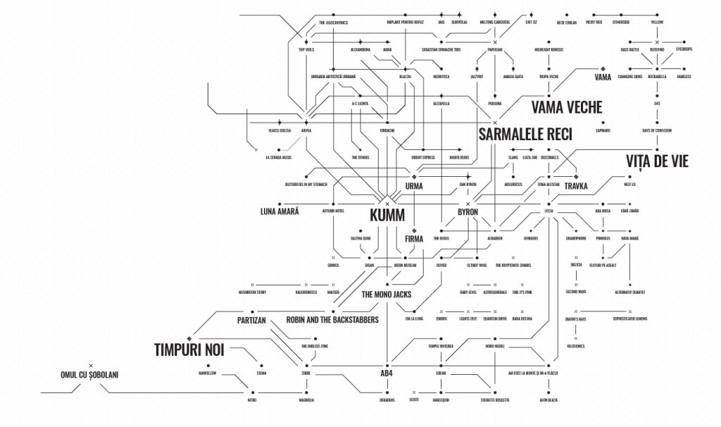 Mi-am imaginat pe cineva complet străin de scena asta alternativă, pășind din ce în ce mai aproape către poster, ca la muzeu. Primul strat pe care îl vezi este cel esențial, trupe-landmark care au avut o influență considerabilă în scenă la rândul lor. Chintesența alternativului românesc în 5-6 artiști. Apoi începi să te duci din ce în ce mai în profunzime – mai mergi un pic și descoperi trupele mari, care sunt (sau au fost) headlineri de festivaluri și evenimente, care strâng sute de oameni la concertele lor sau sunt notorii prin prisma oamenilor implicați în ele. Multe dintre acestea au o istorie bogată în spate. Mai avansezi un pic și vezi trupele aflate cumva în ascensiune, care au un public al lor și o constanță în activitate – aici se află majoritatea numelor de pe hartă. Dacă vrei să explorezi și mai în detaliu, mai faci un pas și ajungi la ultimul strat – artiști aflați fie la început de drum, fie side-projects, fie proiecte vechi și încheiate dar relevante în continuare prin prisma ramificațiilor pe care le au în prezent.