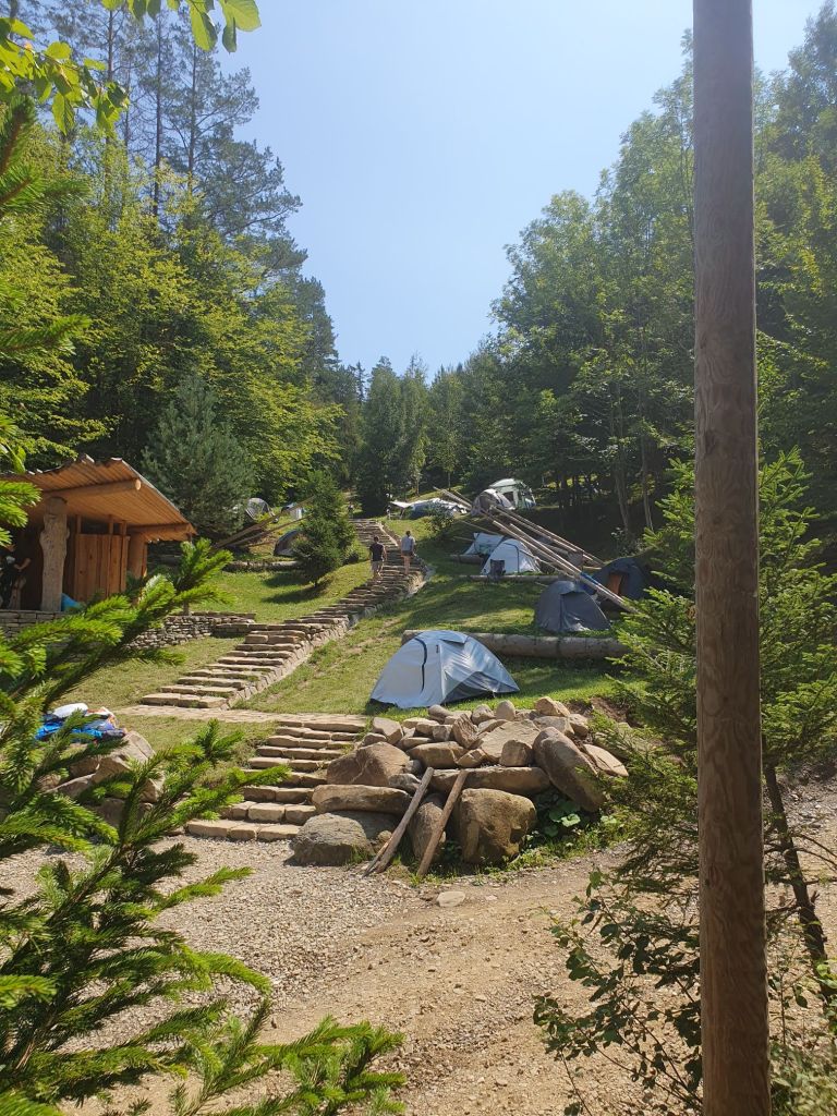 După și dacă scăpai din zona asta ți se deschidea înaintea ochilor poiana amfiteatru unde se întâmplau tot felul de chestii de zi și de noapte și de unde începea printre fagi campingul. Din experiența mea de camper, unul dintre cele mai mișto la care poți sta la un festival, logistic și ca priveliște. Păcat că nu e deschis în restul timpului, dar pare că se gândesc la asta pentru anii ce vin. Era răsfirat prin umbra fagilor cu destule locuri plate amenajate, toalete și alte spații utile integrate în peisaj din lemn și bine întreținute. Nu știu căte corturi au fost, dar să fi fost câteva sute. De acolo, dintre fagi se scurgea lumea în vale la chemarea muzicii.