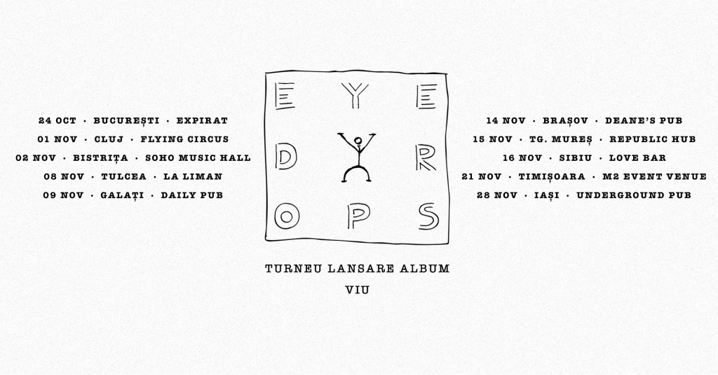 Mi-a fost greu să scriu ce-a stârnit VIU, noul album Eyedrops, în mine. L-am simțit eu ca pe un zbucium sau așa e el? După ce s-au găsit, rătăcit, regăsit și iar pierdut pe albumul anterior (despre care v-am zis aici) pare că zbuciumul și căutarea perpetuă este de fapt starea în care picăturile punk și-au găsit echilibrul. Dacă e un echilibru care să le aducă și succes sau sold-outuri timpul ne-o va zice. Dar măcar și-au făcut-o pe mâna lor 😉. Trupa asta are o istorie deja de mai bine de 10 ani, cu vocalistul Paul Manolescu o constantă – Paul scuze că te-am etichetat așa că tu numai constantă nu ești 😄 -, cu începuturi în alternative indie lejer care ne dădea hituri ca Bicicleta sau Prezent și care aducea în fața scenei preponderent parte feminină ce știa toate versurile. Deși versurile erau inventive ca formă nu supuneau ascultătorul la prea mult contact cu profunzimea din noi. De la un moment dat, moment care se suprapune cu infuzia de bad mofos în trupă, au schimbat brusc macazul sonor, dar și temele abordate în versuri înspre ceva mult mai arțăgos și contondent.. Asta a mai alungat din publicul inițial și acum reclădesc înspre o zonă mai asumată. Rochițele din fața scenei s-au schimbat cu bocanci și geci cu ținte. Ba uneori se poate pune și de un mosh pit discret la concerte. Cam pe zona asta se așează noul album.